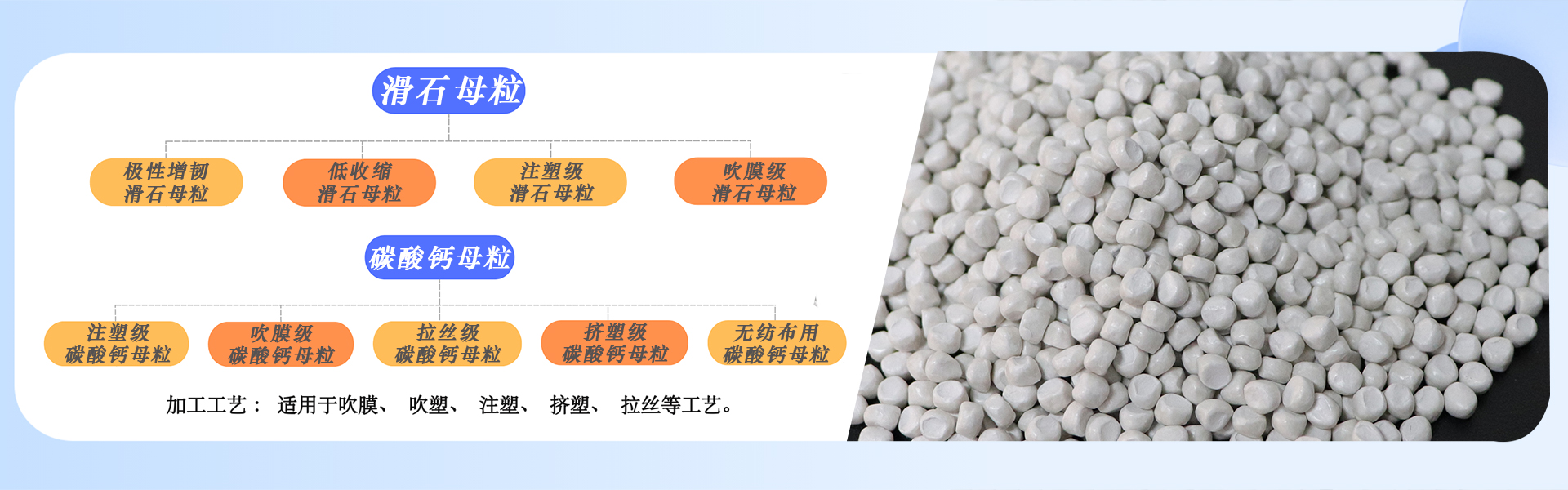 點擊查看本品以行業(yè)通用型的PP(均聚、共聚)、PE(LLDPE、LDPE)、POE、EVA、TPU作基體樹脂,與礦物粉體(滑石粉、碳酸鈣、硫酸鋇)、... ...